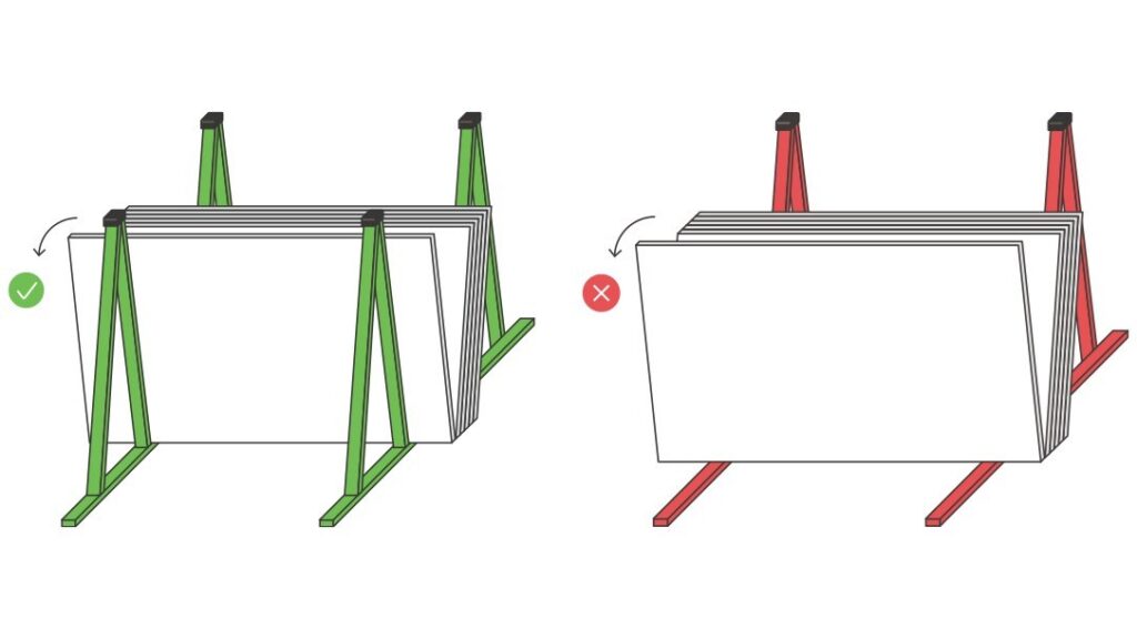 יש לאחסן את הלוחות במקום קריר. אם לא ניתן, יש לספק תמיכה נוספת על ידי בניית עמוד תמיכה שלישי על המעמד, או הנחת לוח בעובי 30 מ"מ כנגד עמודי התמיכה.