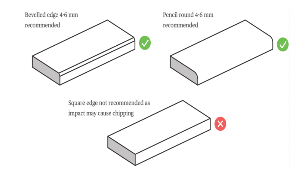 אין ליצור קנטים מרובעים מפני שמכה עלולה לגרום לשברים. יש ליצור פינות מעוגלות ברדיוס של לפחות 3 מ”מ או פאזה של לפחות 3 מ”מ אך עדיף 6-4 מ”מ . ככל שהרדיוס יהיה גדול יותר, הפינה תהיה חזקה יותר.